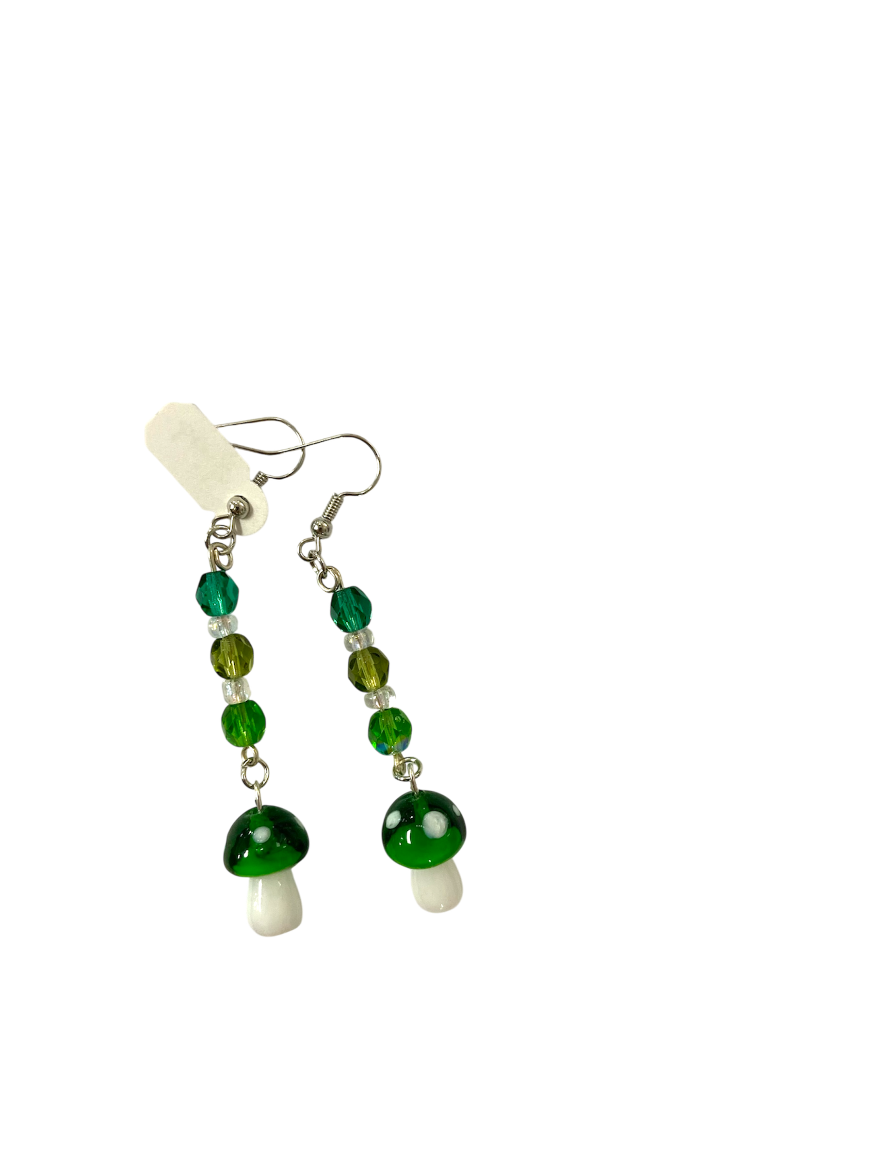 Emerald Wolf - green hand beaded mushroom dangle earrings