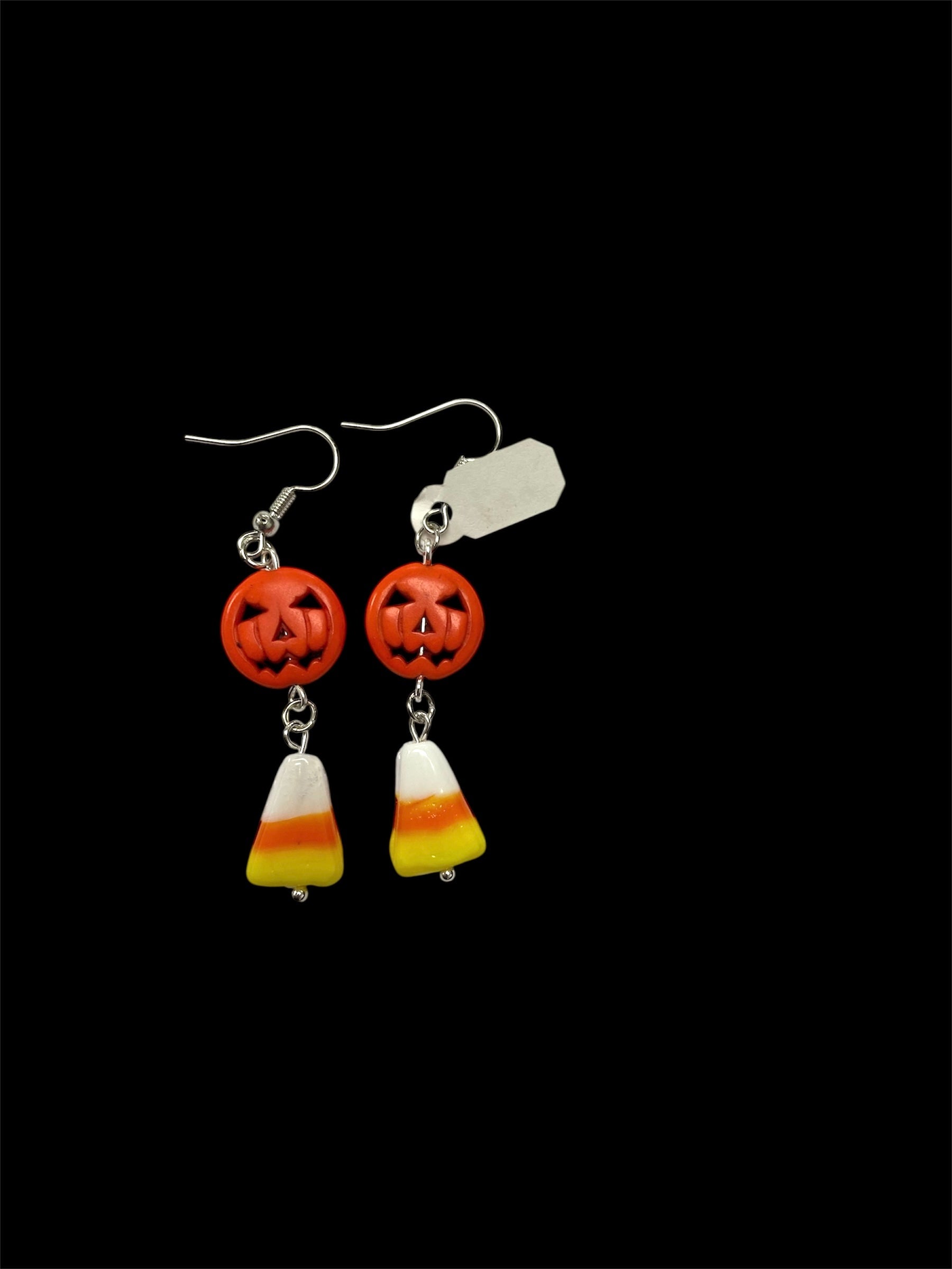 Emerald Wolf- jack-o'-lantern candy corn hand beaded dangle earrings